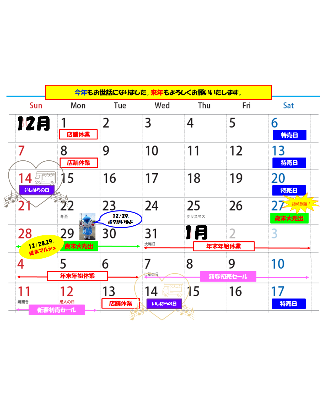 年末年始休業 12/31~1/4 ※曜日により変更あり